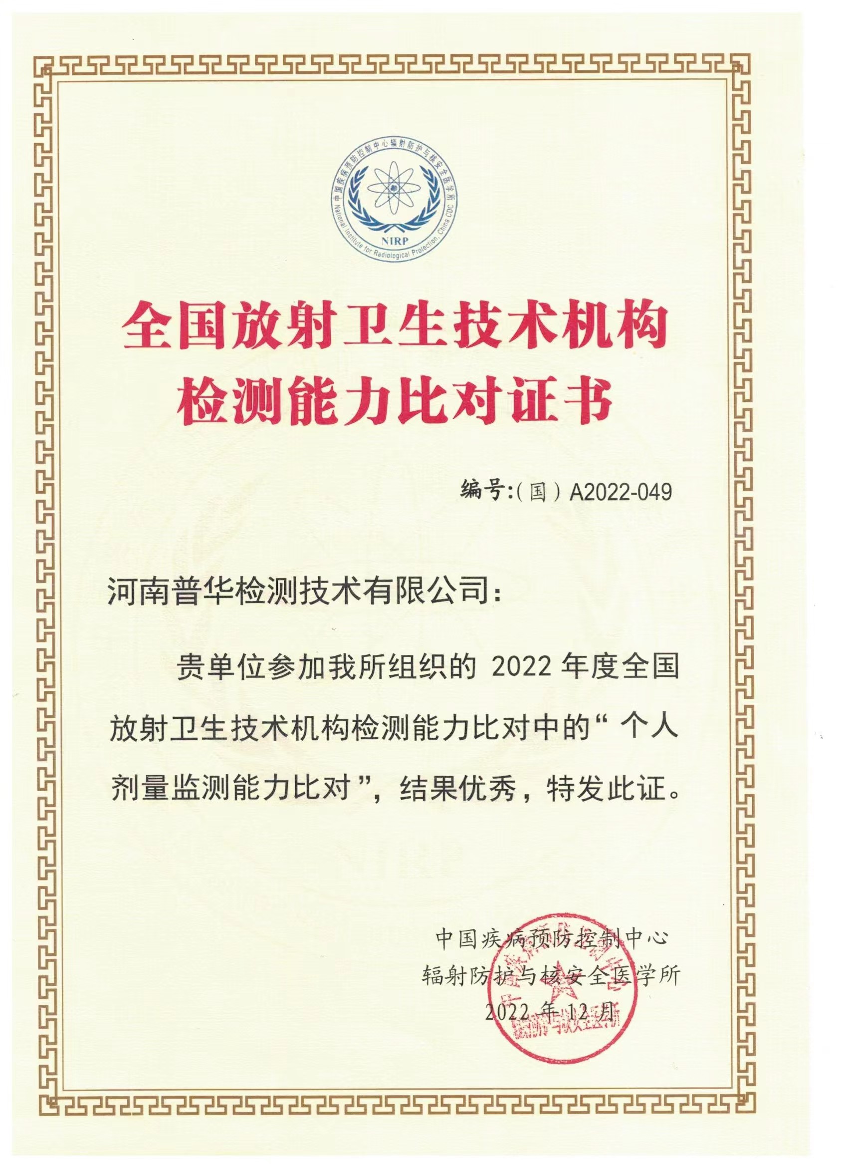 按照《中國疾控中心輻射安全所關于印發(fā)2022年全國放射衛(wèi)生技術機構(gòu)檢測能力比對工作的通知》的要求,我單位參加了由中國疾病預防控制中心輻射防護與核安全醫(yī)學所組織開展的全國放射衛(wèi)生技術機構(gòu)個人劑量監(jiān)測能力比對工作。經(jīng)中國疾病預防控制中心輻射防護與核安全醫(yī)學所考核,我單位所出具的報告各項考核指標均為優(yōu)秀,獲得了考核單位頒發(fā)的2022年度全國個人劑量比對“優(yōu)秀”證書,也是我單位從業(yè)以來第四次取得“優(yōu)秀”成績。