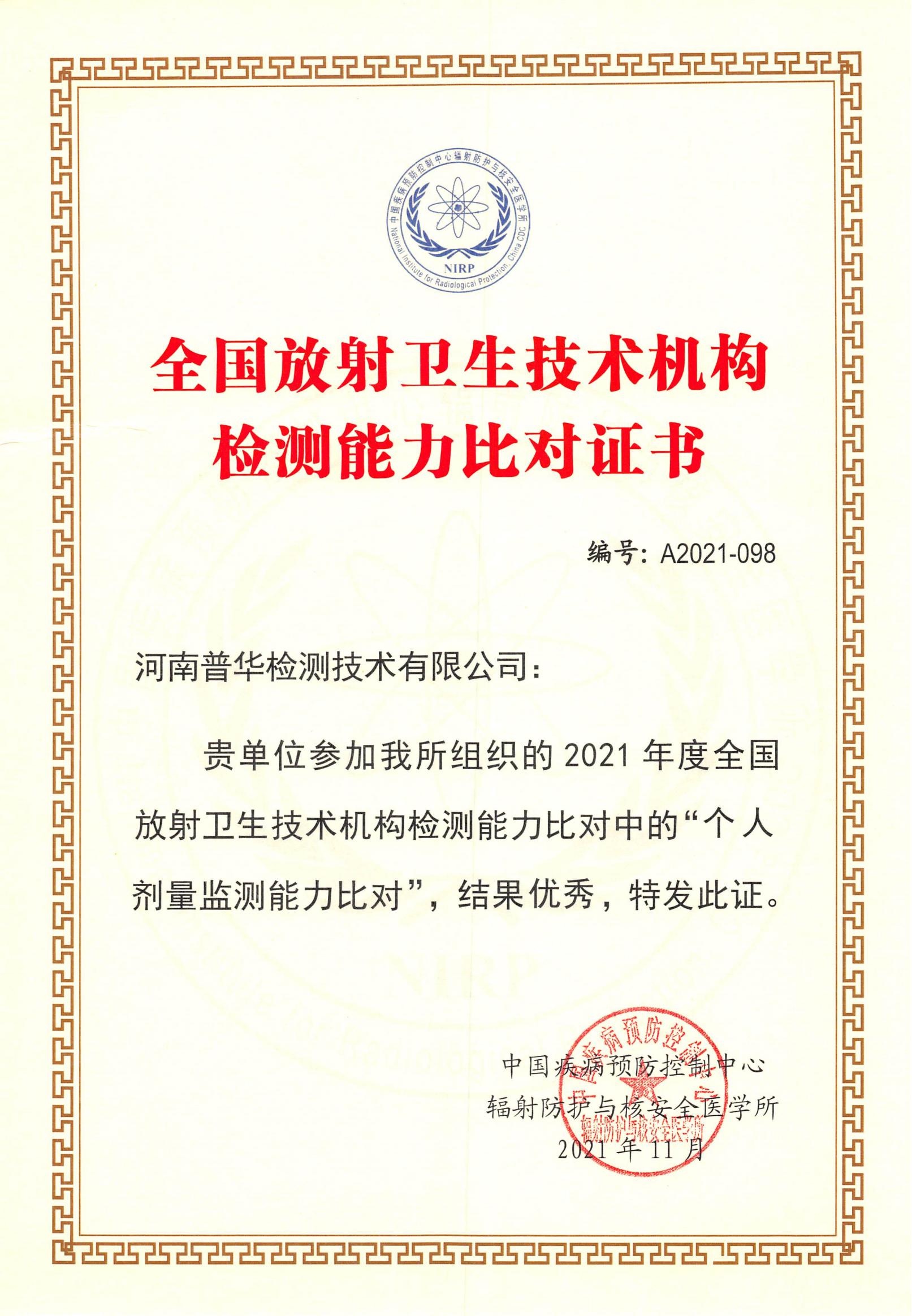 2021年,河南普華檢測技術(shù)有限公司參加了中國疾病預(yù)防控制中心輻射防護與核安全醫(yī)學(xué)所舉辦的“2021年度全國放射衛(wèi)生技術(shù)機構(gòu)檢測個人劑量監(jiān)測能力比對”,我公司出具的考核報告各項指標(biāo)均名列前茅,并獲得“優(yōu)秀”證書,這是公司在個人劑量監(jiān)測國家考核中第三次取得“優(yōu)秀”成績。